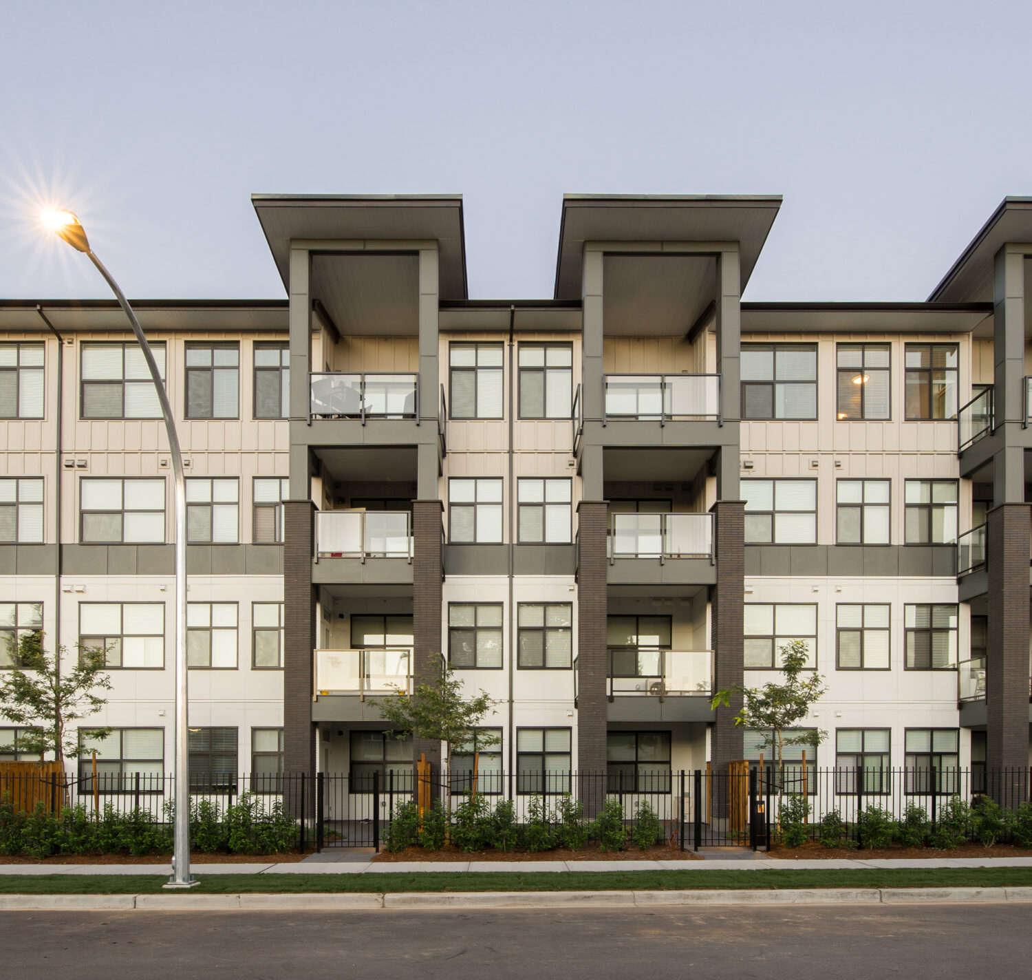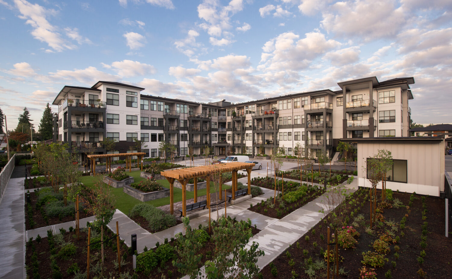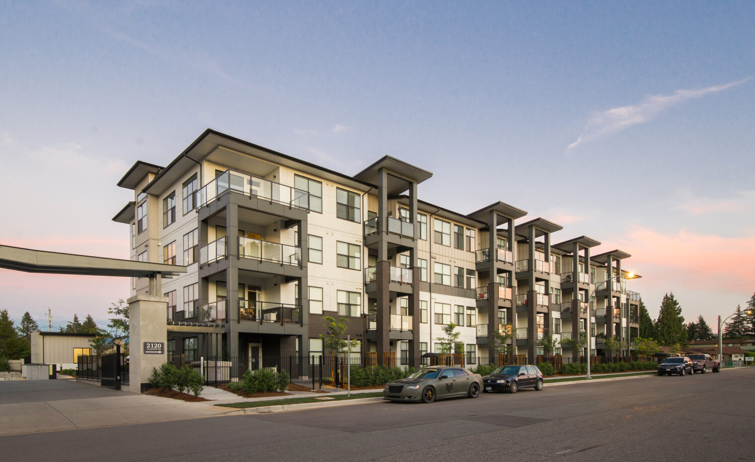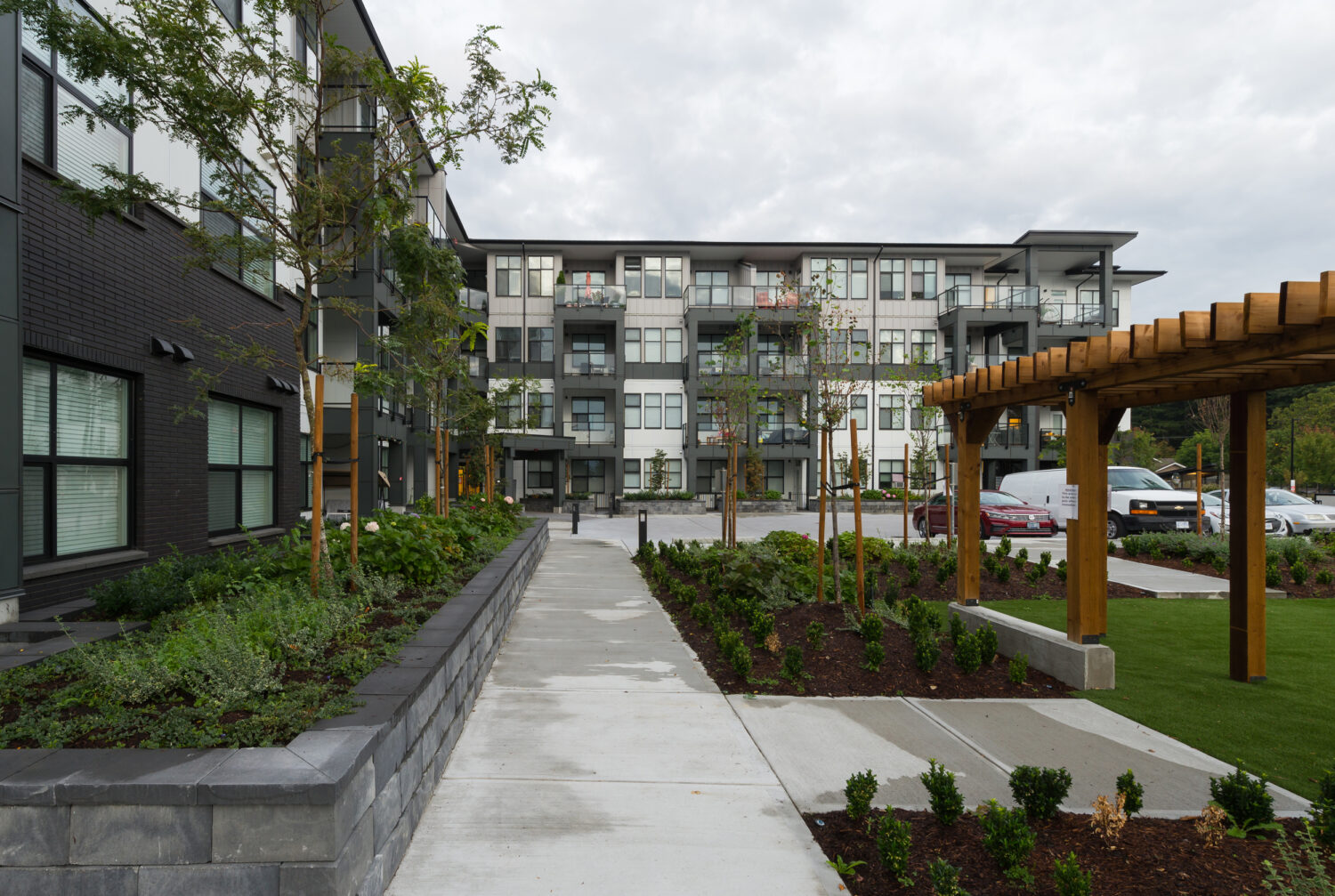 87 condominiums completed in 2021. A wide selection of plans, ranging in size from 1 bedroom to 2 bedroom and den family-sized homes over 1100 sq. ft. Stunning modern design featuring dramatic black brick, with extensive landscaping featuring an elegant courtyard garden with a sculpture. And Mill Lake Park, just steps away.
